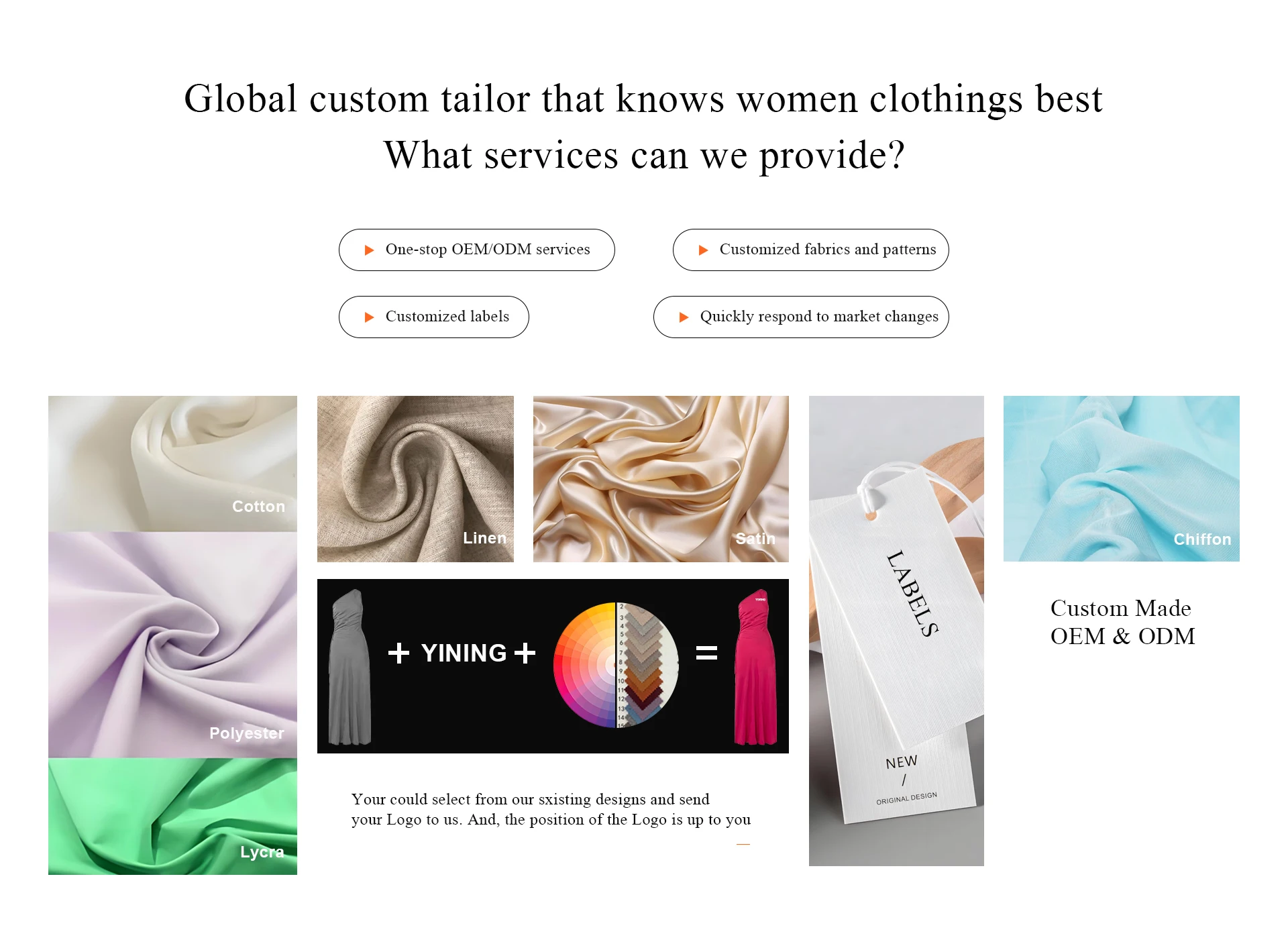 Productos principales:Vestido ajustado, vestido con cuello en V, vestido acampanado, vestido de encaje, vestido estampado